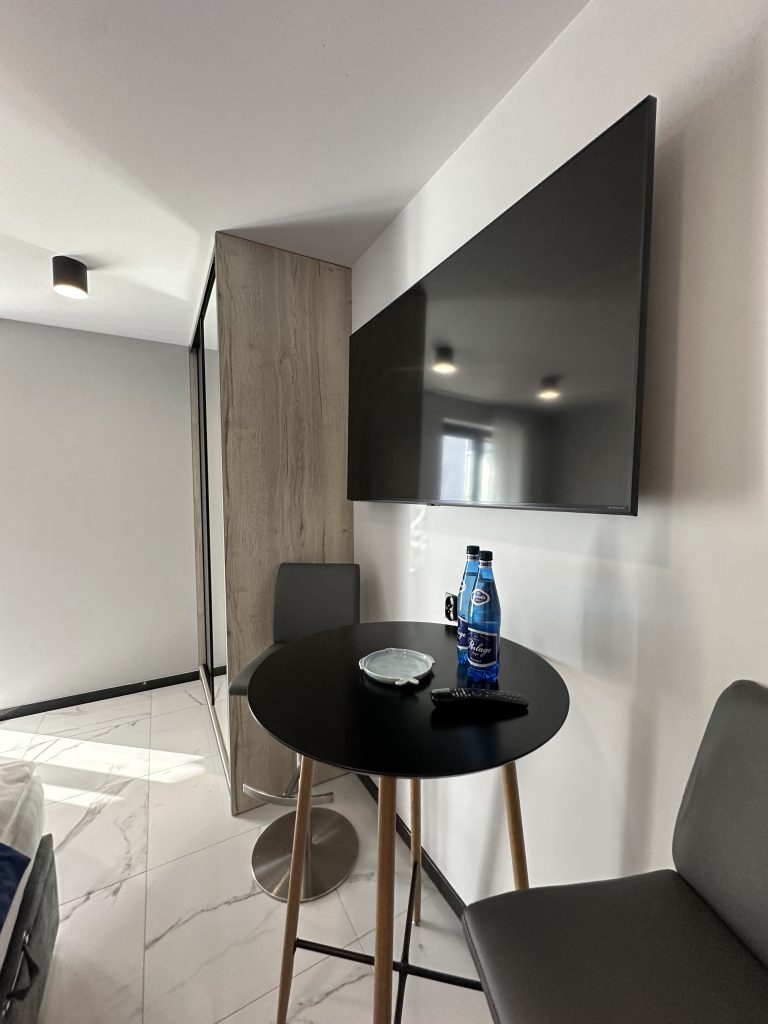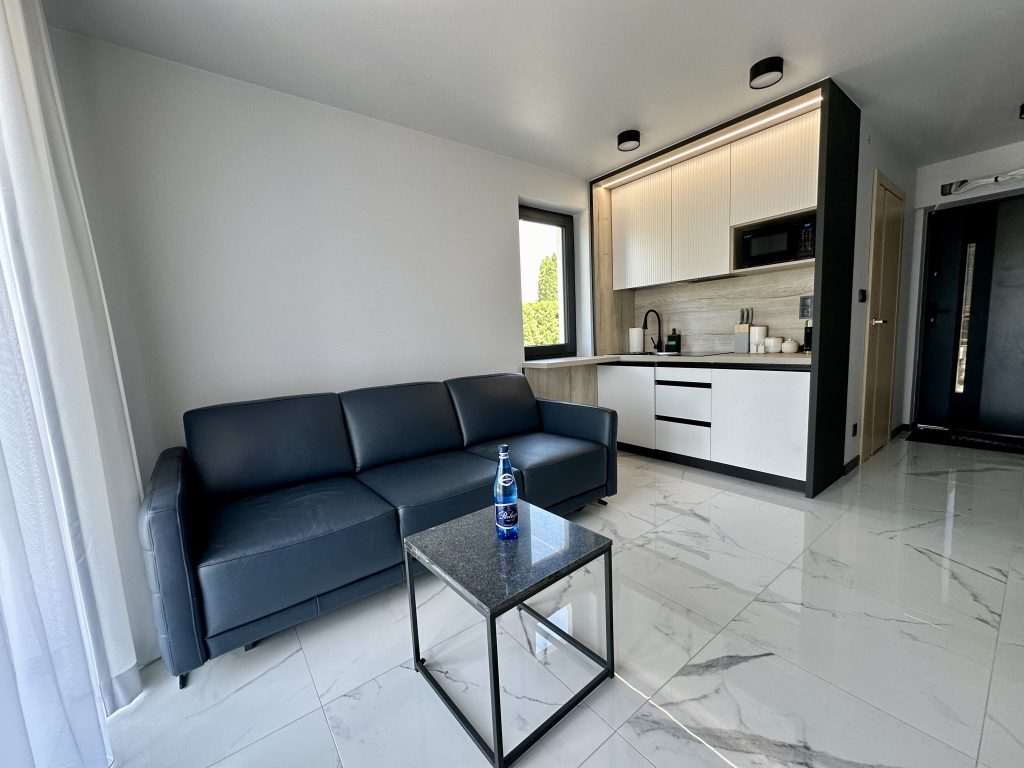 Studio LAGO 2 – Komfortowe studio z minimalistycznym wnętrzem i przestronnym balkonem, zapewniające wygodę i spokój.